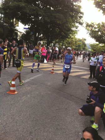 Ao chegar na pista de acesso à estrada a história muda e você descobre quem é quem. Como minha base de ciclismo foi boa, passei praticamente as 5 horas da modalidade pedindo licença e ultrapassando a galera. Vácuo não é autorizado, mas perdi as contas de quantos pelotões eu passei. E esses sanguessugas vinham na minha roda. Era difícil me livrar deles. As vezes alguns pelotões fechavam a faixa inteira e não havia nem espaço pra ultrapassagem. Cheguei a passar pela faixa dos carros, fora dos cones de segurança, pra poder me livrar deles. Memorizei o número de alguns atletas que às vezes apareciam na minha roda. Um deles até conseguiu vaga pro mundial no Havai. Coisa feia eu falava ao ultrapassá-los mas eles não se intimidavam e continuavam colados roda com roda. Bom, os fiscais até apareciam, mas não conseguiam fiscalizar 100% do percurso.